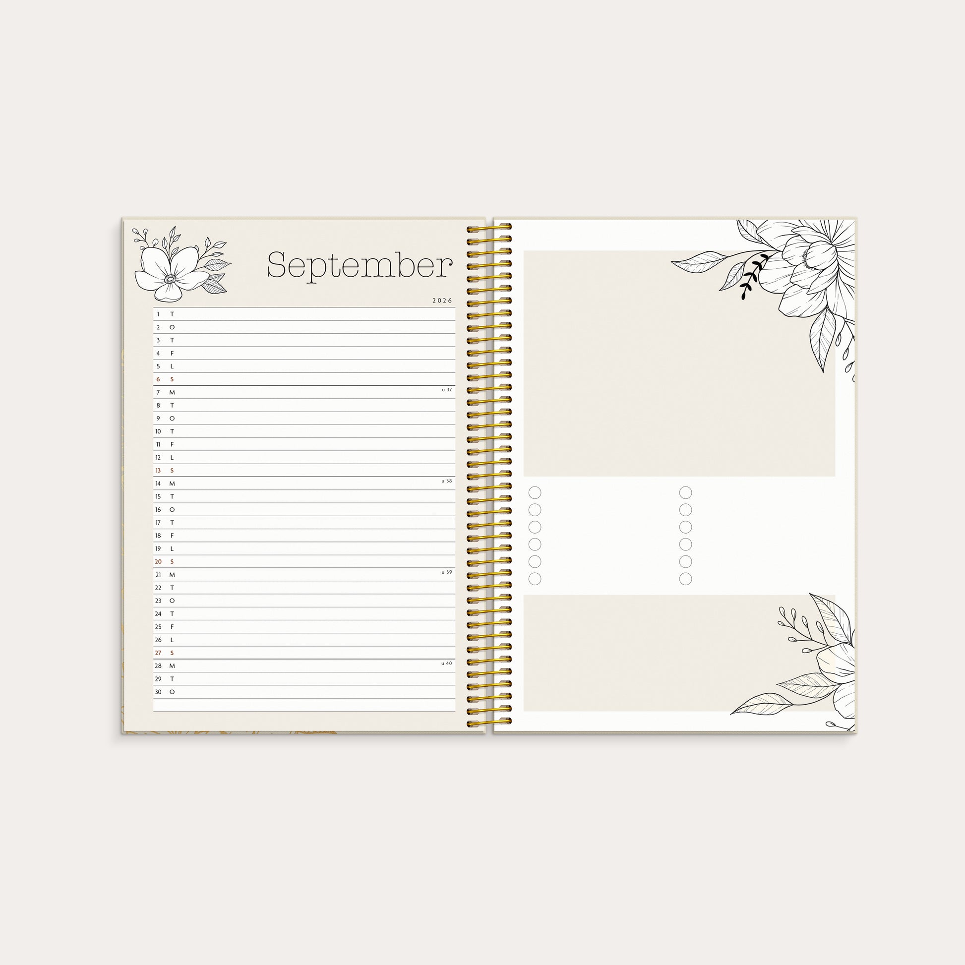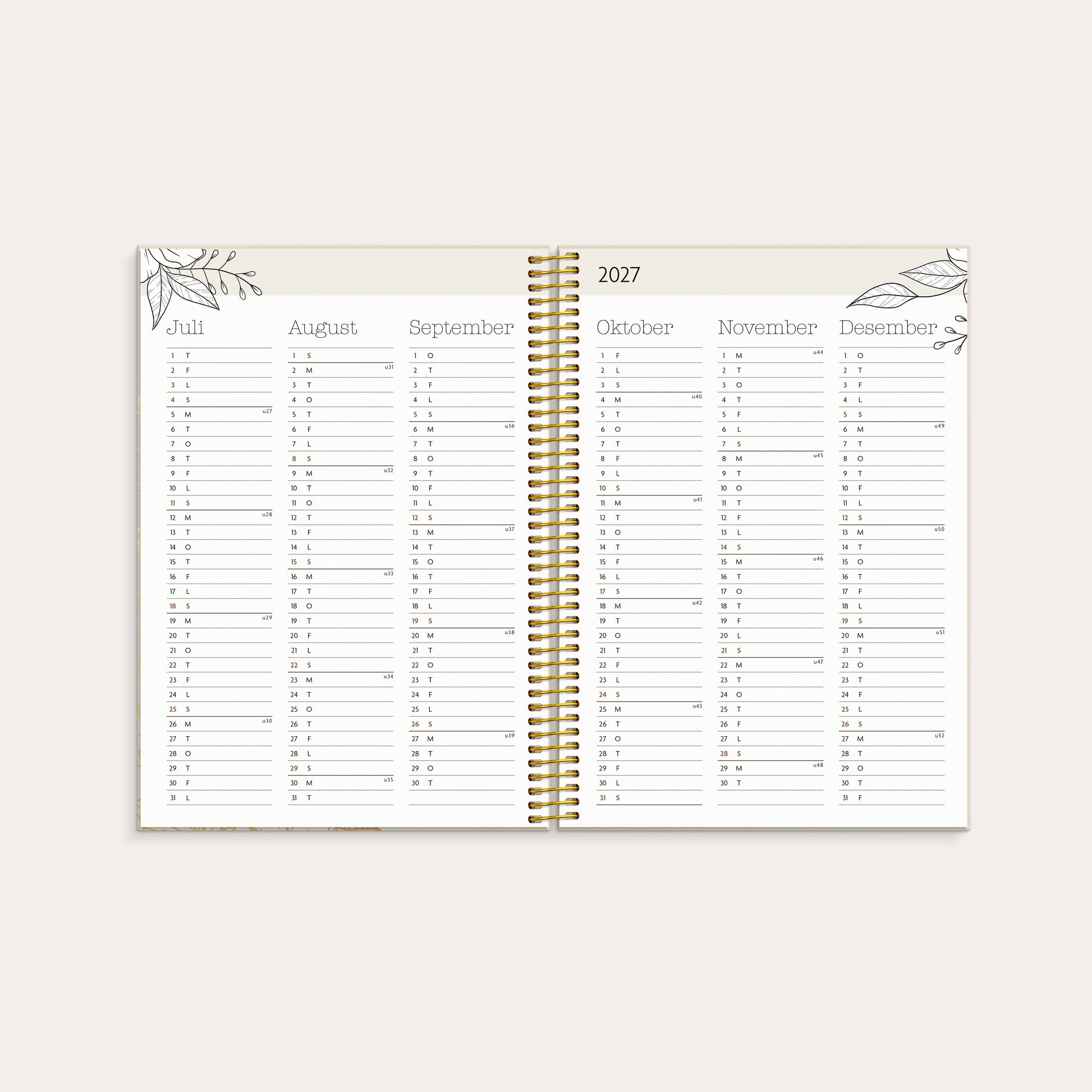 Smakfull og romantisk innmat med håndtegnede illustrasjoner. Brukeren kan velge å beholde den dempede fargeskalaen eller fargelegge selv. Årsoversikt med notatfelt, årsplanlegging og ukentlig oppslag med romantiske blomsterillustrasjoner. Månedlig oppslag med plass til planlegging og notater. Ekstra sider med huskelister og notatsider. Kalenderen er miljømerket FSC®, som betyr at hele produktet er produsert med papir og annet trevirke fra et ansvarlig og bærekraftig skogsbruk. Format 148 x 210 mm.