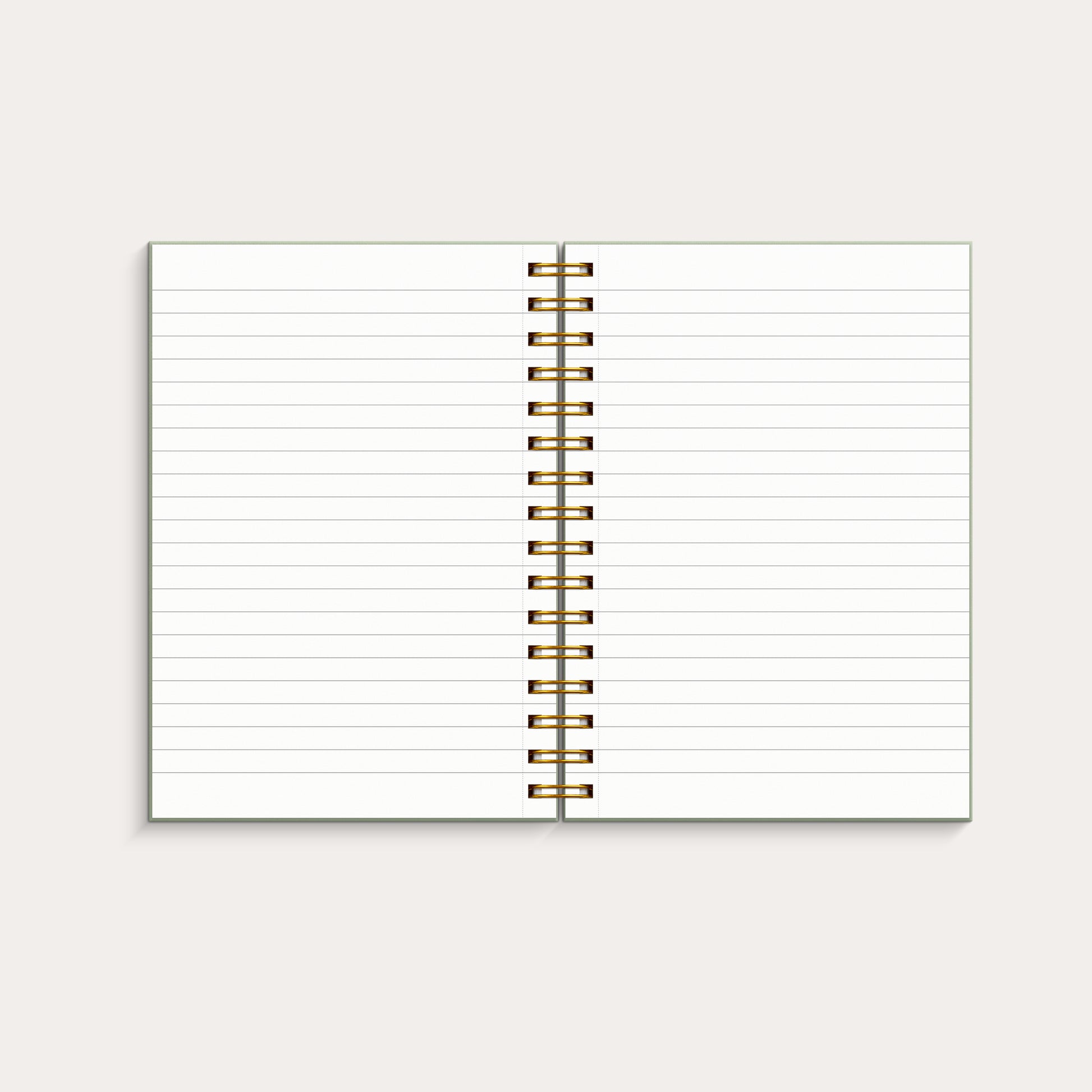 A light green notebook with a matte cardboard cover and a gold-coloured spiral for a modern and stylish feel. Contains 300 lined pages – perfect for notes, lists, meetings or creative ideas.