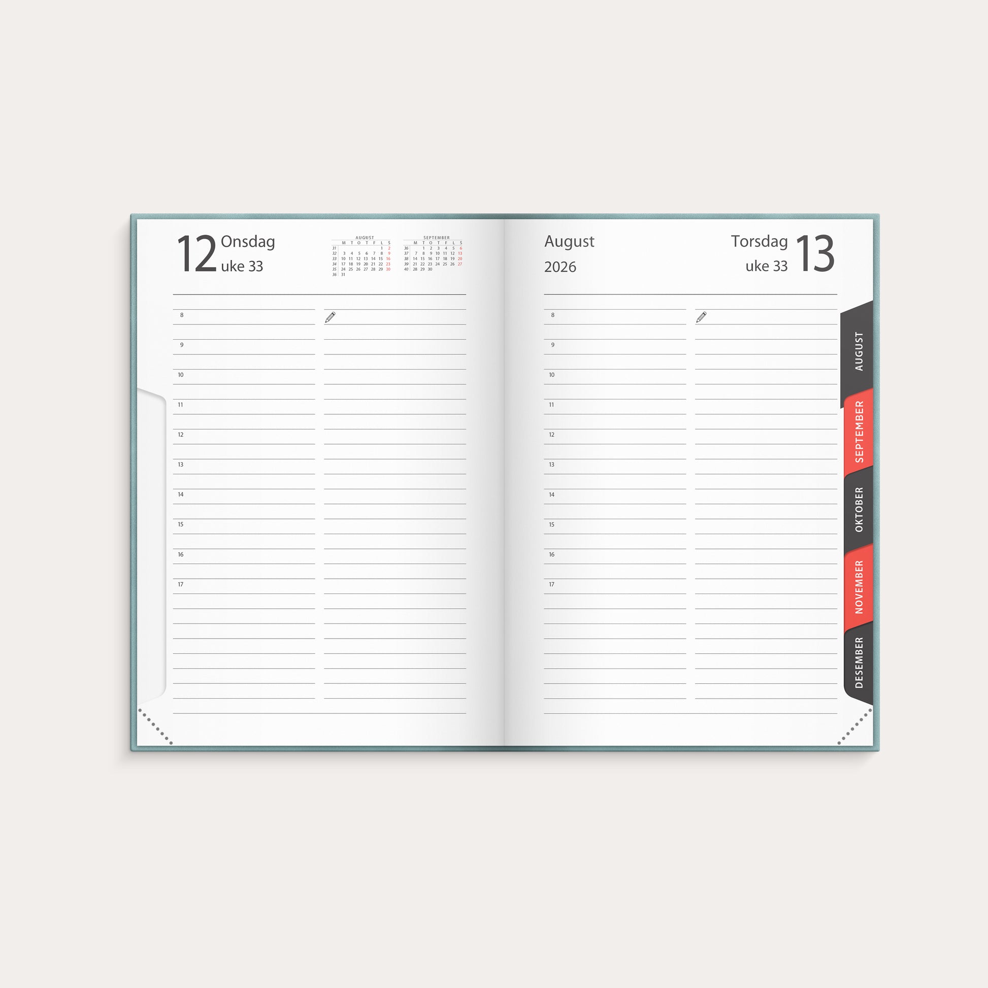 Libra Colore er en lekker innbundet dagbok i imitert skinn. Kalenderen er en del av en større serie med Libra kalendere. Felles for disse er at de har et hendig format som gjør den enkel å ta med seg, og en dag pr side gir deg masse plass til å skrive ned dine avtaler og notater. Utstanset månedsregister gjør det enkelt å finne rett måned. Bruk lesebåndet til å markere hvor i kalenderen du er.