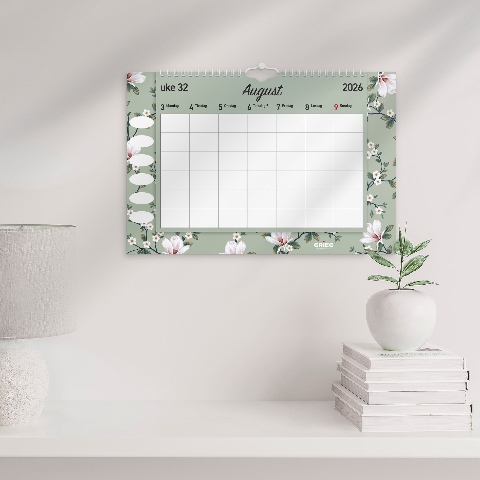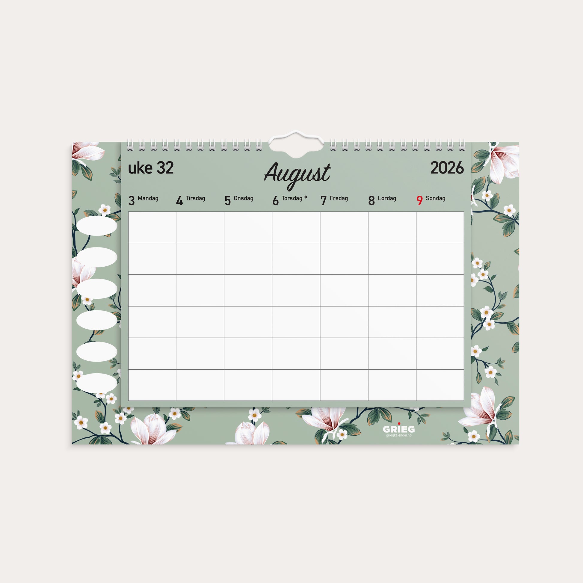Kalenderen er miljømerket FSC®, som betyr at produktet er produsert med papir og annet trevirke fra et ansvarlig og bærekraftig skogsbruk. Format 355 x 240 mm inkl. bakplate .
