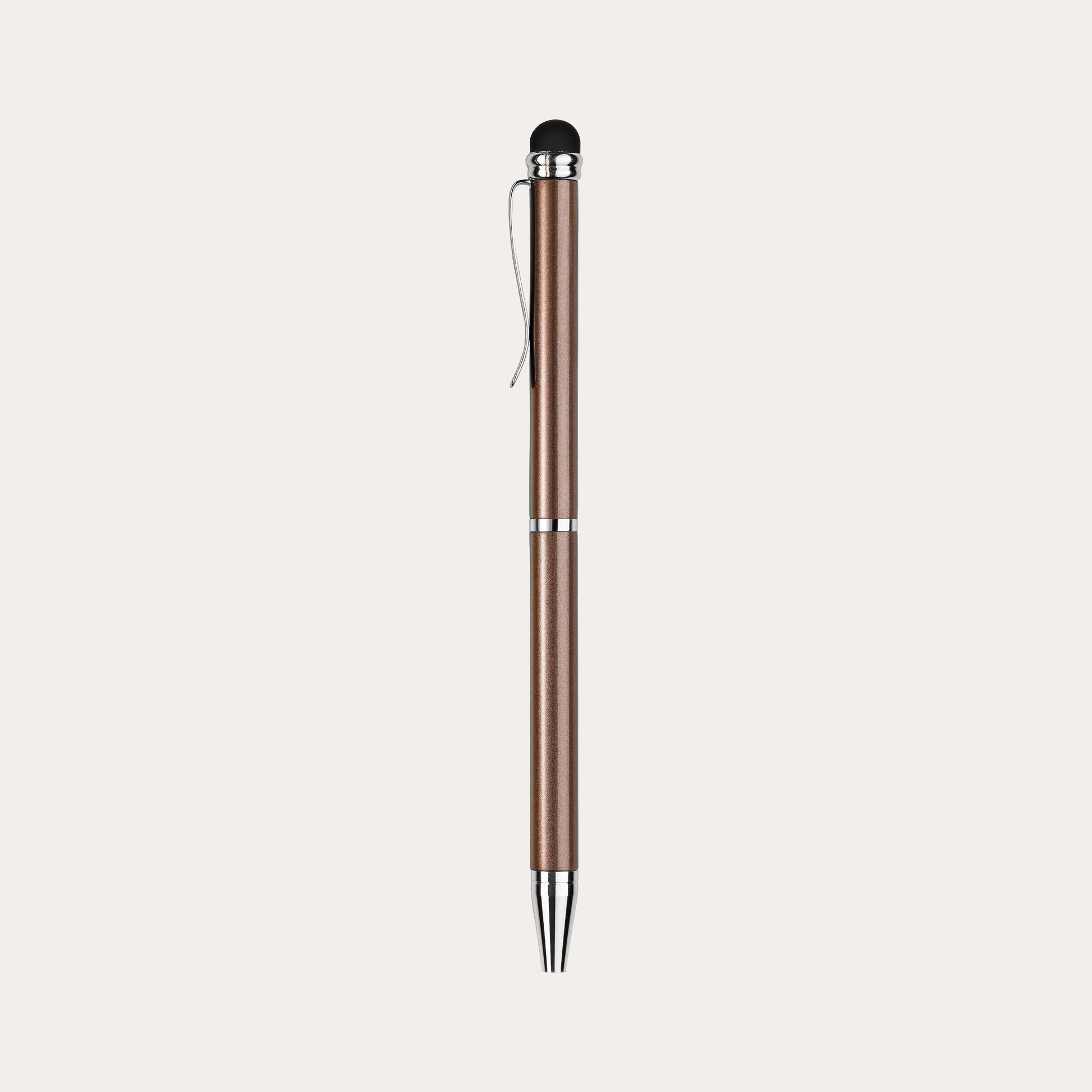 Liten kulepenn med et elegant og smalt design med klips og innebygd touch-funksjon. Pennen kan enkelt festes med klipsen på kalenderen eller notatboken din slik at du alltid har med deg noe å skrive med. Den innebygde touch-funksjonen er perfekt for bruk på mobilen eller nettbrettet. Lengde 110 mm. Blått blekk.