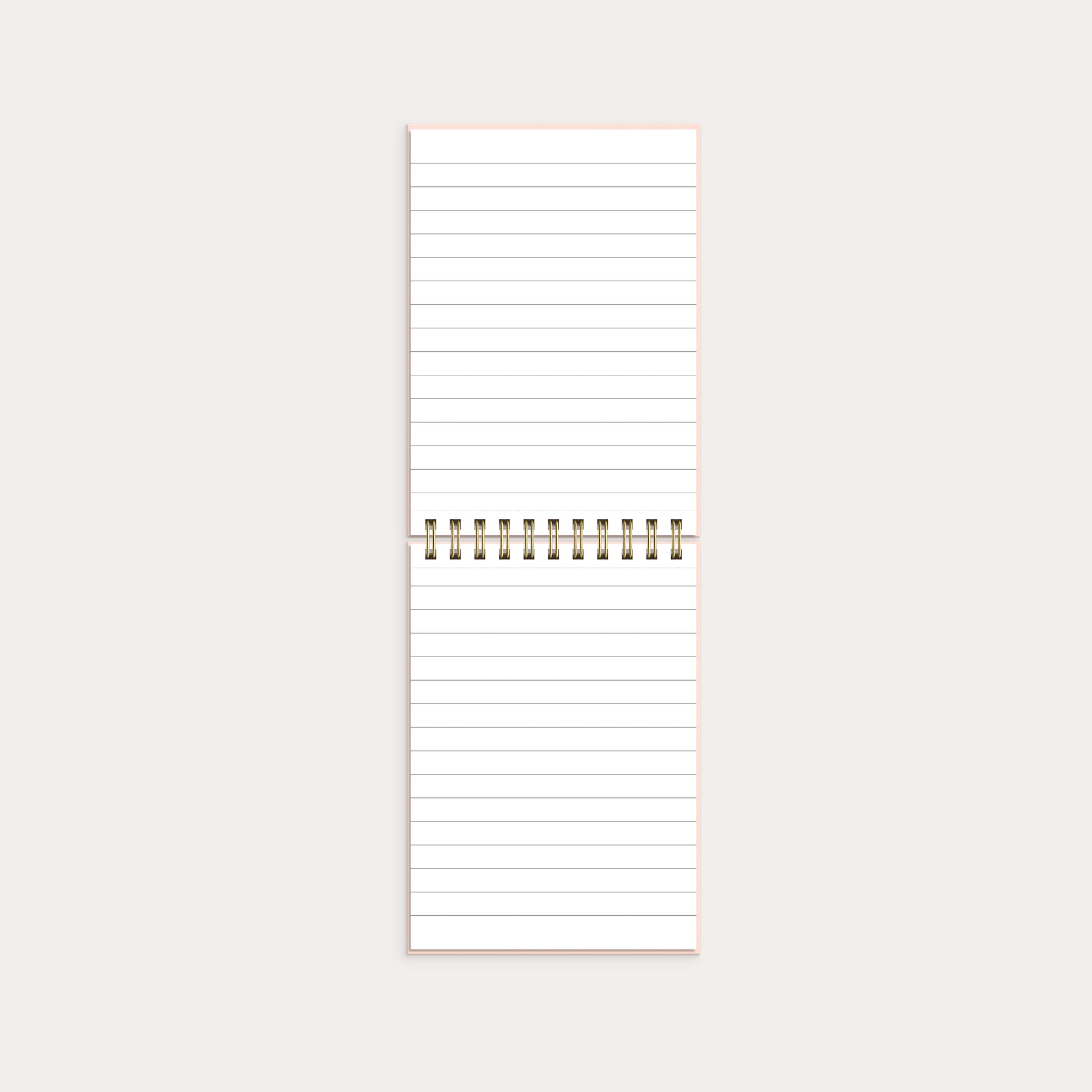 Notatblokk/journalistblokk med rosa kartongomslag og stjernemønster i gullfolie. Designet med fokus på funksjon og form. Perfekt for raske notater på farten – enten du er på reise, intervjuer eller møter. Spiralen i toppen gjør det enkelt å bla og skrive stående. Inneholder 100 linjerte sider.