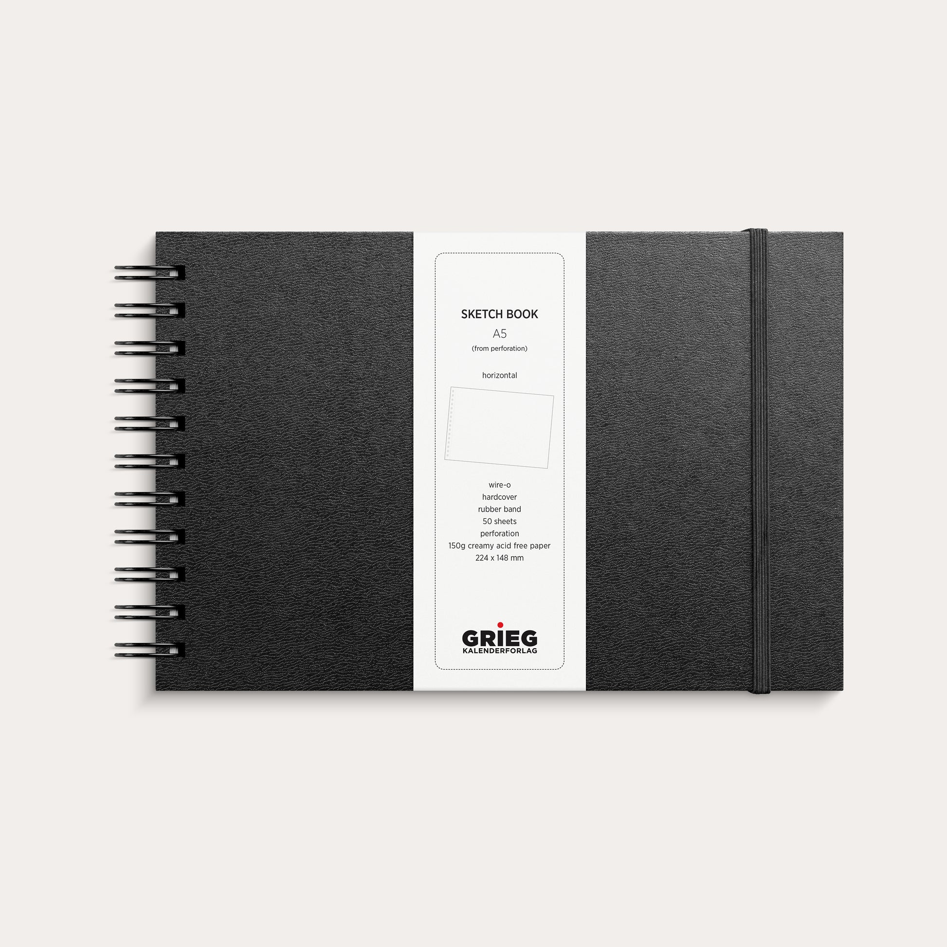 Skisse- og tegnebok med kunstskinn hardcover. Spiralisert rygg. Strikk for lukking. Perforert rivekant på arkene. 150 g kremfarget syrefritt papir, 50 blad (100 sider). Format: A5 (210x148 mm).