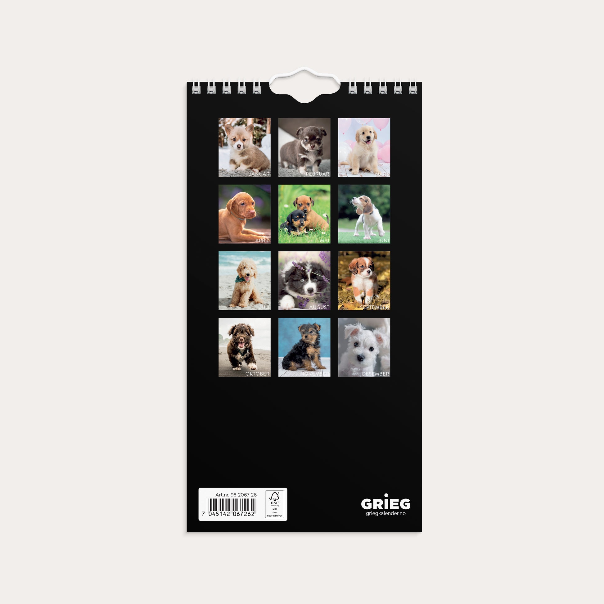 Liten, lettplassert veggkalender med hundevalper. Ett nytt bilde for hver måned. I månedskalenderen er det mulighet for å notere.