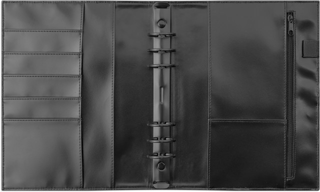 Klaff til lukking og glidelåslomme på innsiden. Penneholder, seddellomme, kredittkortlommer, linjal og skillekort. 6 ringer ø 30 mm. Format: 185 x 235 mm